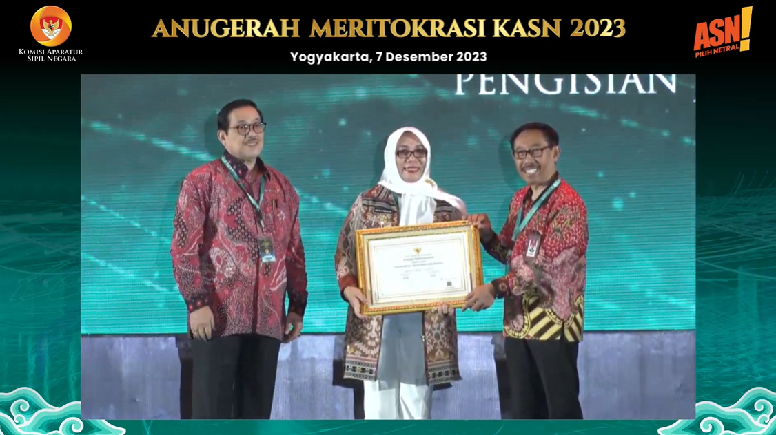 Penghargaan yang diberikan Ketua KASN, Agus Pramusinto di Yogyakarta, Kamis (7/12/2023) hari ini diterima langsung oleh Penjabat (Pj) Wali Kota Pangkalpinang, Lusje Anneke Tabalujan.