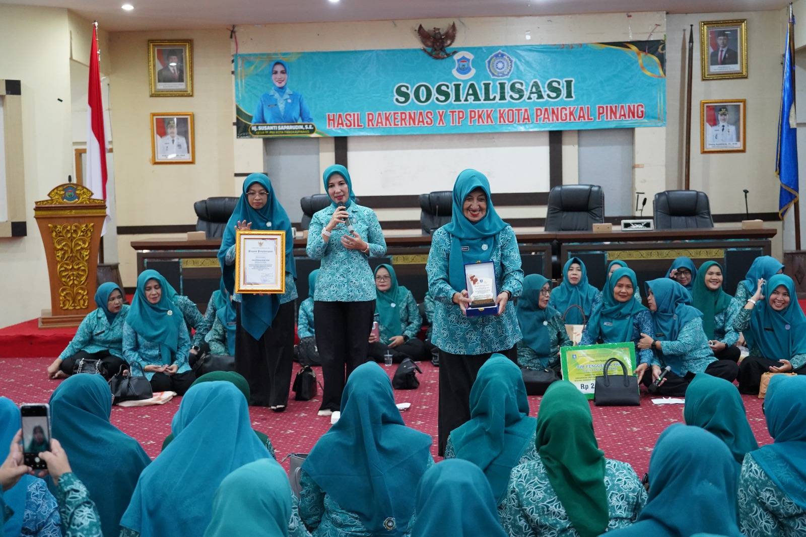 PANGKALPINANG, DISKOMINFO – Suasana berbeda mewarnai pertemuan Tim Penggerak PKK Kota Pangkalpinang yang digelar di Balai Besar Betason, Rabu (14/1/2026). Ini merupakan pertemuan perdana tahun 2026 bersama para kader. Meski berlangsung dengan konsep duduk lesehan, pertemuan bersama kader PKK kelurahan dan kecamatan ini tetap berjalan kompak, tertib, dan lancar. Konsep tersebut justru menciptakan suasana yang lebih dekat, akrab, dan penuh kebersamaan antara pengurus TP PKK Kota Pangkalpinang dengan para kader di tingkat kecamatan dan kelurahan.Ketua TP PKK Kota Pangkalpinang, Susanti Saparudin, S.E., dalam pertemuan tersebut memaparkan sejumlah program dari masing-masing bidang yang akan dilaksanakan sepanjang tahun 2026.Ia menekankan pentingnya sinergi, kekompakan, dan kolaborasi dari seluruh tingkatan PKK agar setiap program dapat berjalan selaras dan saling mendukung.Sebagai organisasi yang bersentuhan langsung dengan masyarakat, TP PKK dinilai berada di garda terdepan dalam upaya pemberdayaan keluarga dan peningkatan kesejahteraan masyarakat. “PKK juga berperan sebagai mitra strategis pemerintah daerah dalam mendukung program pembangunan dan pelayanan kepada masyarakat, khususnya di tingkat keluarga dan lingkungan terdekat. Tentunya kita harus selaras dan sejalan dengan program pemerintah,” ujar Susanti. Susanti berharap tahun 2026 menjadi momentum semangat baru bagi seluruh kader TP PKK, dengan tetap berpedoman pada aturan yang berlaku serta tertib dalam administrasi.Ia juga menyampaikan apresiasi atas dedikasi dan kerja keras seluruh kader PKK yang telah berkontribusi aktif sepanjang tahun sebelumnya.”Saya sangat mengapresiasi seluruh kader atas upaya dan kerja samanya dalam membantu agar PKK kota terus tumbuh dan memberi manfaat bagi masyarakat, ” ucapnya. Kinerja TP PKK Kota Pangkalpinang yang solid turut mendapat apresiasi dari Pemerintah Provinsi sebagai organisasi wanita teraktif dan berprestasi, yang diterima pada Desember 2025.