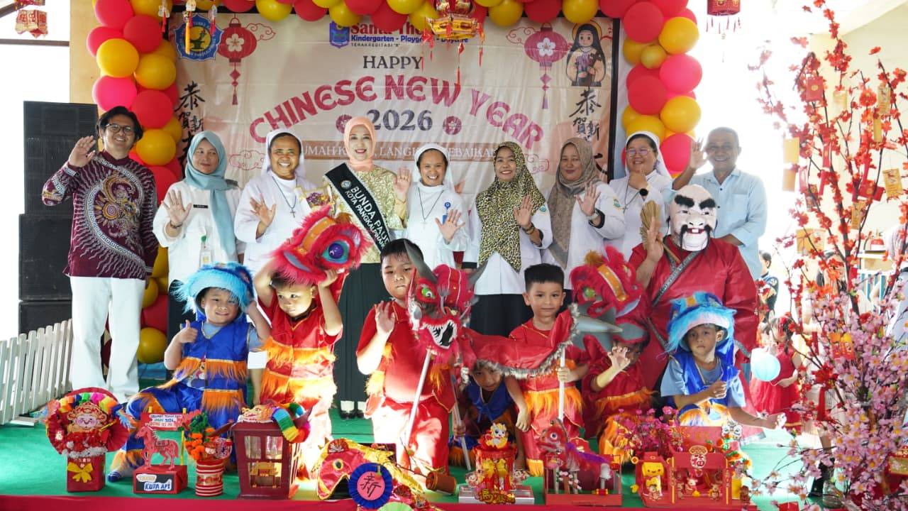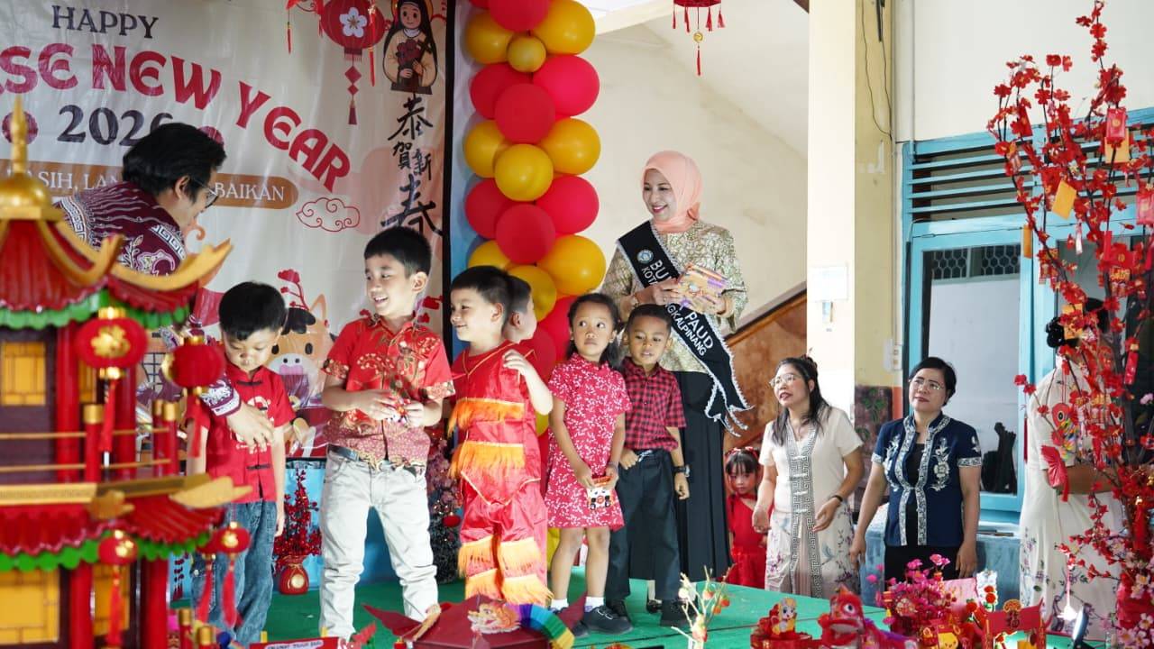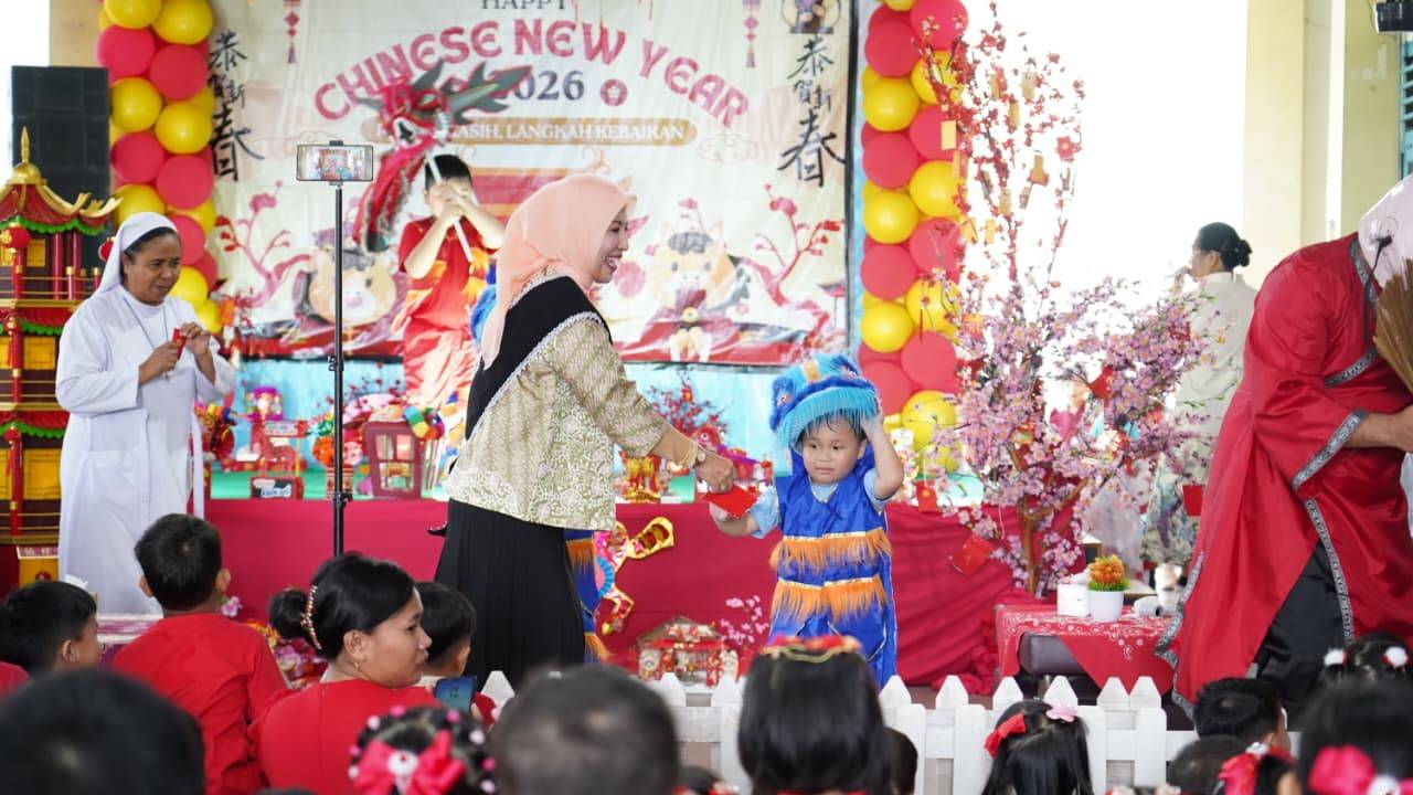 PANGKALPINANG, DISKOMINFO – Bunda PAUD Kota Pangkalpinang, Susanti Saparudin, S.E., menghadiri Pentas Seni Tahun Baru Imlek yang digelar KB/TK Santa Theresia 1 Pangkalpinang, Rabu (25/2/2026). Kegiatan ini mengusung tema “Rumah Kasih, Langkah Kebaikan” dan berlangsung dalam suasana hangat serta penuh semangat kebersamaan.
