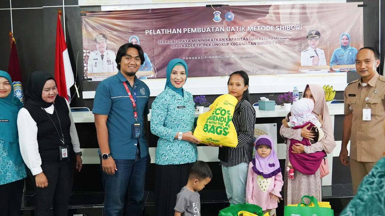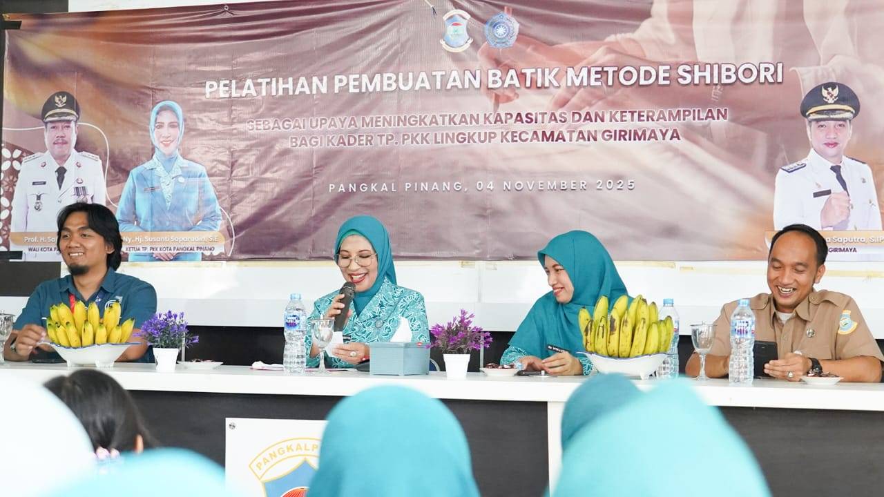 PANGKALPINANG, DISKOMINFO – Ketua TP PKK Kota Pangkalpinang, Susanti Saparudin, S.E., membuka pelatihan membuat batik metode shibori di Kantor Camat Girimaya, Selasa (4/11/2025). Kegiatan ini diikuti kader PKK se-Kecamatan Girimaya yang tampak antusias belajar teknik membatik modern tersebut.